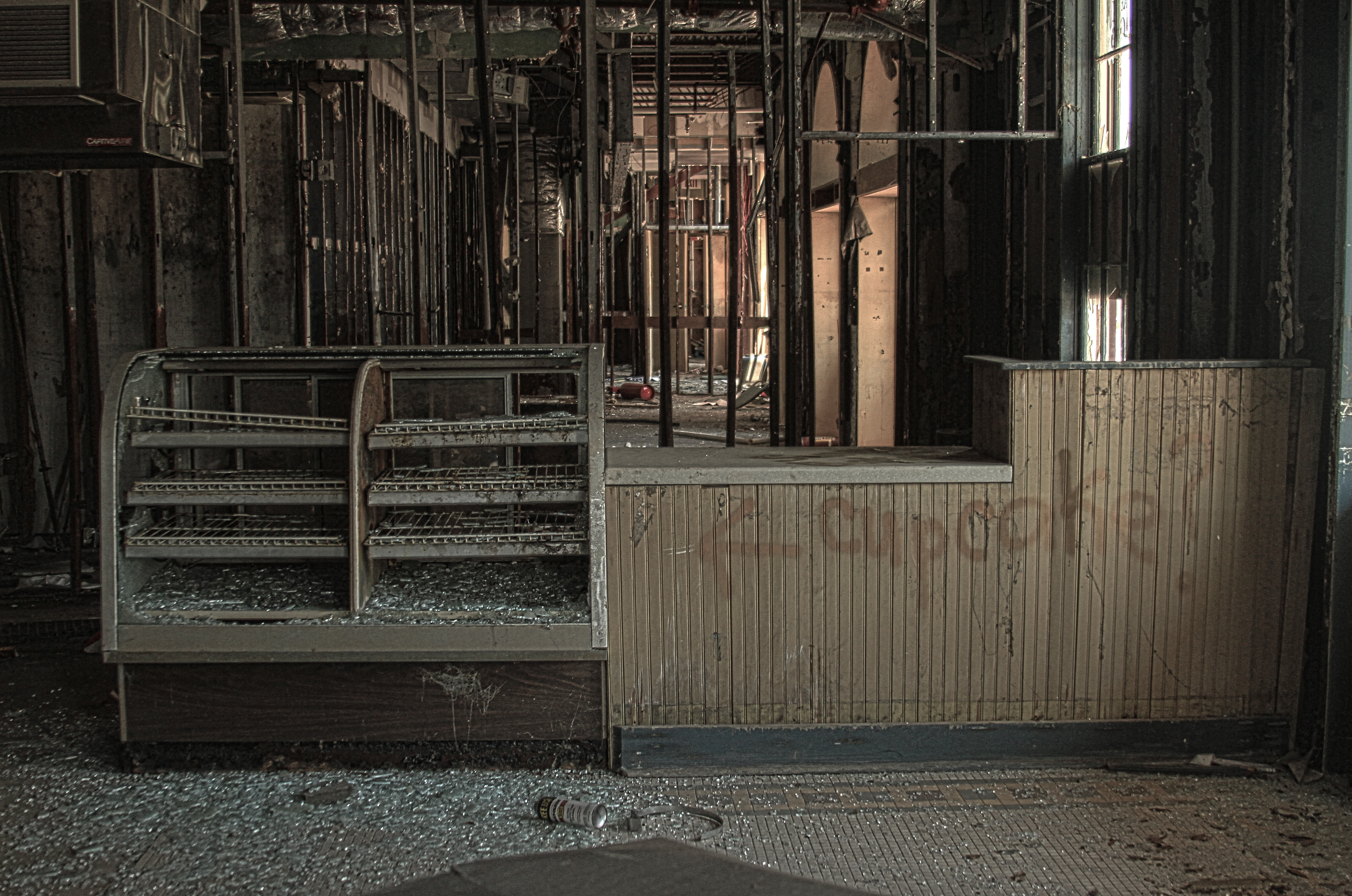 This photo is the second from Six Flags. The exterior facade of most of the buildings remained intact albeit covered in graffiti, but the interiors had been completely stripped. It was done so efficiently I wondered if a demo team had been put in place to get it all done. This is what is left of the bakery in the Old West section on the park.