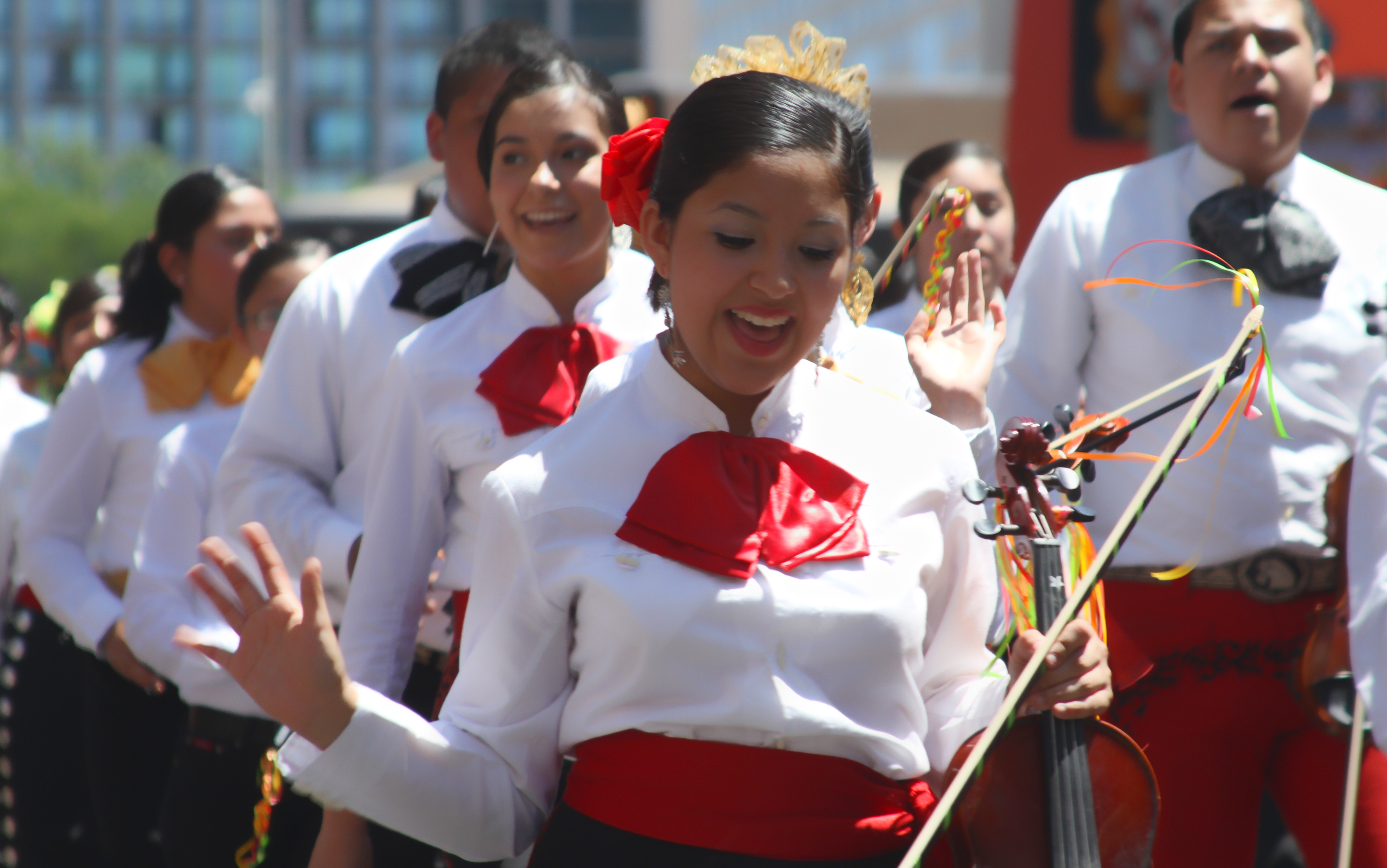 This girl was both cute and shy as her Mexican orchestra strutted down the street.